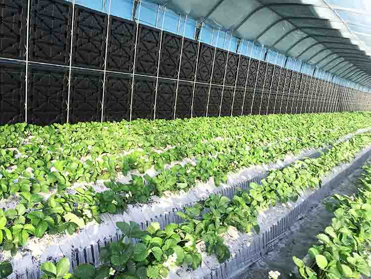 為了達到合理蓄熱的目的,日光溫室蓄熱系統也經歷了土墻、磚墻墻體保溫到相變材料的不斷更新。受傳統日光溫室蓄熱材料粘土或磚本身的物理性質的限制,能達到的蓄熱量有限。理論上,選用比熱容更高的水可能會收獲更多蓄熱量。粘土或磚的比熱容分別僅為水的1/3和1/4,也就是說單位質量的水蓄熱內外雙保溫裝配式日光溫室蓄熱體每升高或降低1℃可以吸收或放出的熱量是土墻或磚墻3~4倍。實踐證明,水蓄熱墻體的蓄熱能力顯著強于土墻或磚墻。崔世茂教授介紹說,在水蓄熱內外雙保溫裝配式日光溫室中,水箱墻體蓄熱方面有明顯創新,蓄熱技術主要是利用太陽能白天照射加溫水箱,晚上通過水箱持續放熱保持溫室內溫度可達到6 ℃以上(同期室外氣溫-30 ℃),夜間增溫效果顯著,這樣就能夠保證溫室中越冬生產栽培的草莓和番茄可以正常生長,產量高、品質好!
