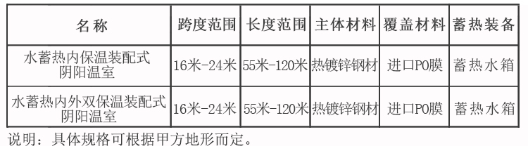 水蓄熱內(雙)保溫裝配式陰陽溫室配套設備包括:溫室主體、骨架系統、(前坡、后坡)外膜系統、(前坡)內膜系統、(前后坡上、下)放風系統、(前坡)內保溫系統、(前坡)外保溫系統、新型水蓄熱系統、安裝系統、供電系統。