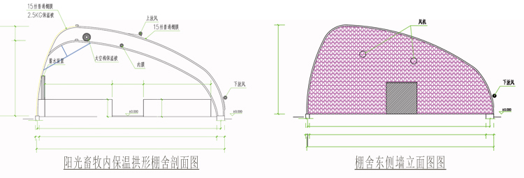 陽光畜牧內保溫拱形棚舍配套設備包括:棚舍主體、骨架系統、外覆蓋系統、內保溫系統、內膜系統、放風系統、新型蓄熱裝置等。