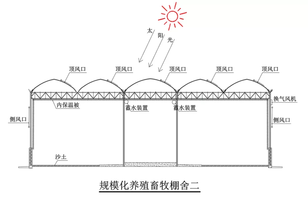 進行畜牧養殖的溫室稱為畜牧養殖溫室。配備智能控制系統的畜牧棚舍稱為智能保溫陽光畜牧棚舍。棚舍(內蒙古畜牧棚舍)整體采用鋼架結構,輕便耐用;四周及頂部薄膜覆蓋;后墻及頂部后坡整體覆蓋毛氈型保溫被;頂部及四周設置通風口;棚舍內部在頂部及四周有保溫被;桁架上方設置接滴露薄膜及導流槽;內部設置一地下水池,供牛羊飲水。為節約投資可連棟使用。特別適用于大型畜牧養殖企業,單棟適用于大跨度不同禽類的單獨養殖。