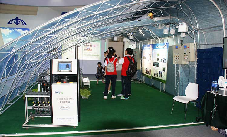 在展區(qū)中間,一座名為“新型裝配式內(nèi)保溫日光溫室&陽(yáng)光畜牧棚舍”格外引人注目。這個(gè)外表是蔬菜暖棚的龐然大物,里面設(shè)置了LED智能顯示器、智能放風(fēng)和卷簾控制系統(tǒng)、營(yíng)養(yǎng)液施肥機(jī),還擺放著無(wú)土栽培綠色蔬菜樣品供觀眾觀賞。