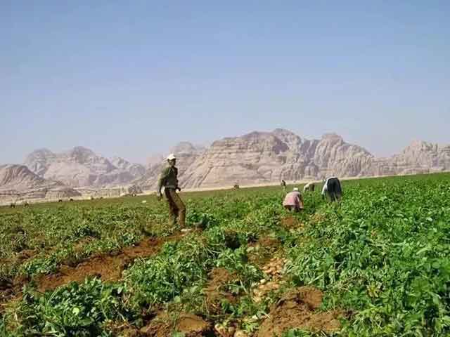 種植者從百米深的地下含水層中抽取水,利用噴嘴對圓形農(nóng)田進行灌溉,這樣可以較大限度節(jié)省水源。這里種植的種類包括茄子、卷心菜、無花果、石榴、馬鈴薯、南瓜、西紅柿等多種蔬菜。農(nóng)場的技術(shù)相當(dāng)成功,使得目前該農(nóng)場生產(chǎn)著約旦大部分的糧食。